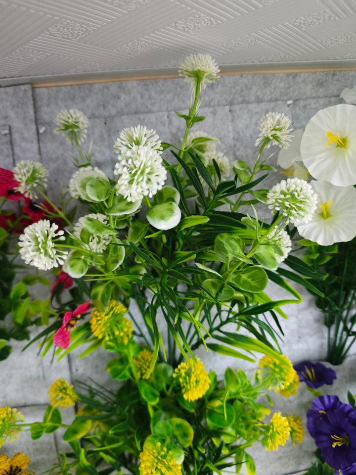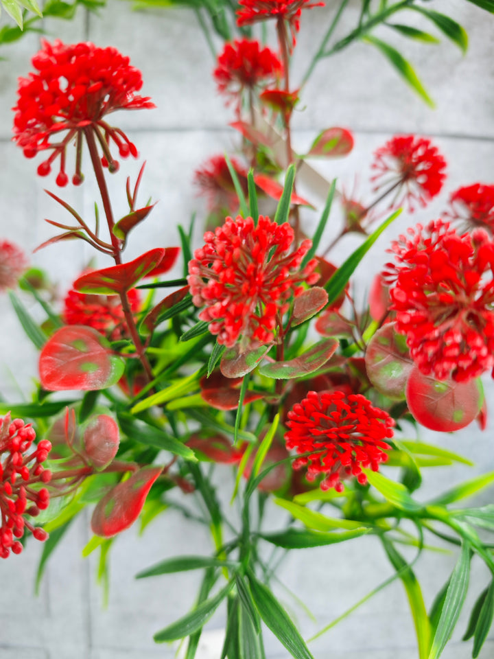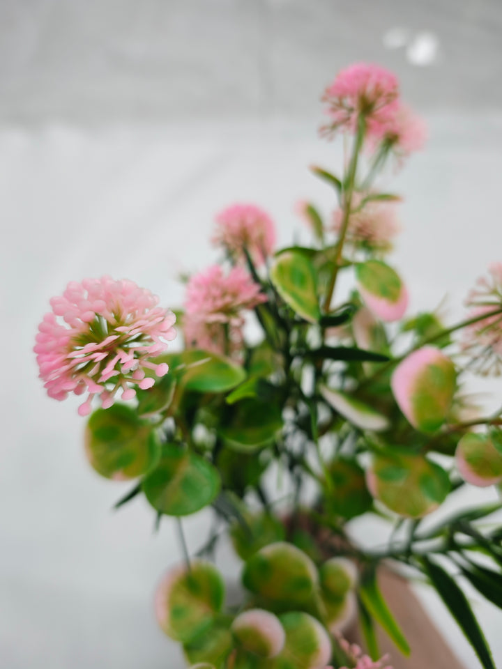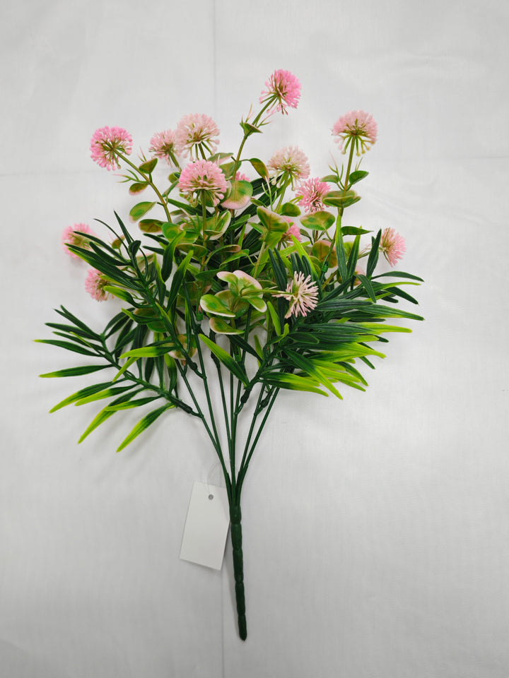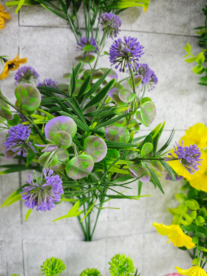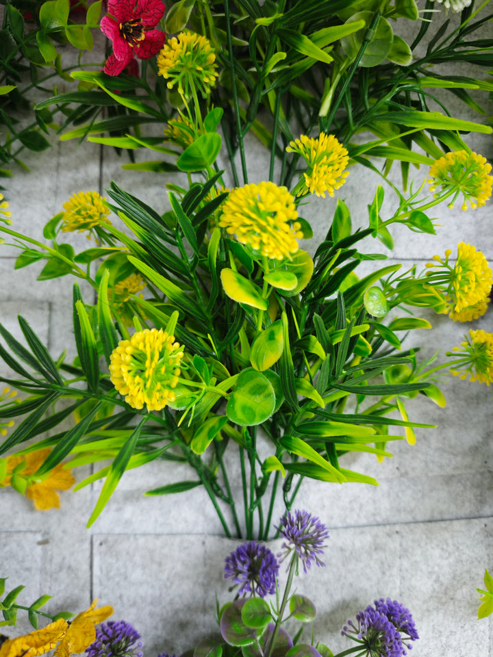 This artificial floral bush features charming spherical flower heads and a mix of narrow pine-like blades and rounded coin leaves. Its botanical texture, vibrant color palette, and lightweight structure make it perfect for spring-themed arrangements, store displays, or everyday interior styling. Available in multiple vibrant tones including soft pink, bright red, green, purple, yellow, and white.